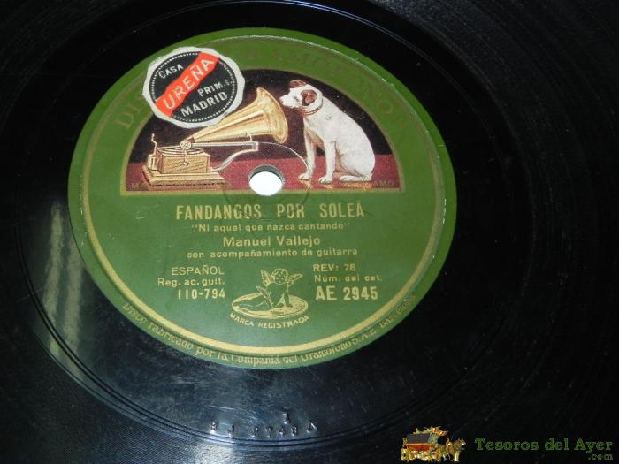 ANTIGUO DISCO DE PIZARRA DE MANUEL VALLEJO, SOLEARES ( LOS PASITOS QUE YO DABA) / FANDANGOS POR SOLEA (POR AQUEL QUE NAZCA CANTANDO), AE 2945, BUEN ESTADO DE CONSERVACION, DISCO GRAMOFONO.
