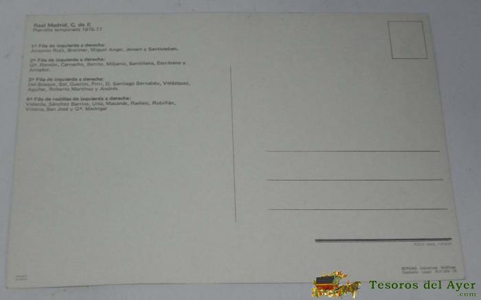 POSTAL GIGANTE PLANTILLA DEL REAL MADRID C DE FUTBOL, TEMPORADA 1976/77, MIDE 21 X 14,5 CMS., SIN CIRCULAR, FOTO RAUL CANCIO, ED. BERGAS, MIDE 21 X 14,7 CMS.