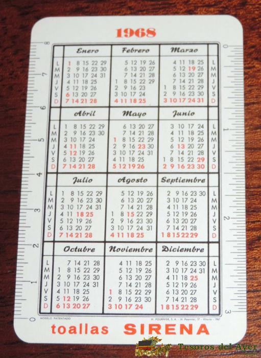CALENDARIO HERACLIO FOURNIER, CON PUBLICIDAD DE TOALLAS SIRENA 1968, VER FOTOGRAFIA ADICIONAL PARA COMPROBAR EL ESTADO DEL REVERSO.
