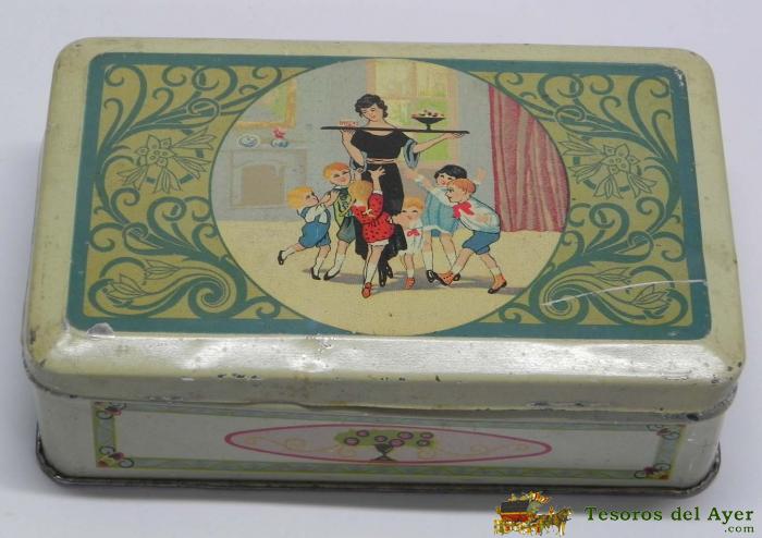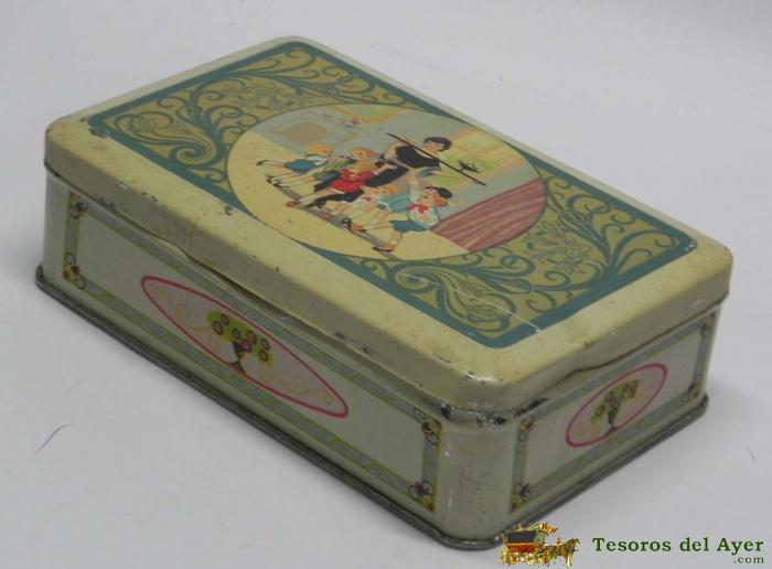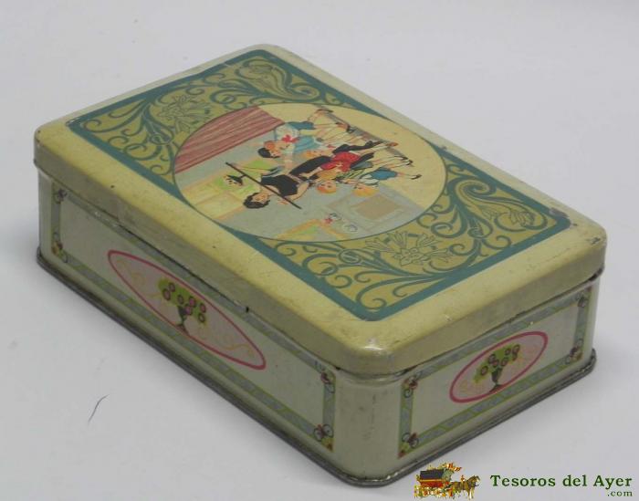 CAJA DE HOJALATA LITOGRAFIADA CON PUBLICIDAD DEE CONFITERIA Y FABRICA DE ALMENDRAS DE ALCALA DE HENARES DE C. MARON, MIDE 15 X 9,5 X 4,5 CMS.
