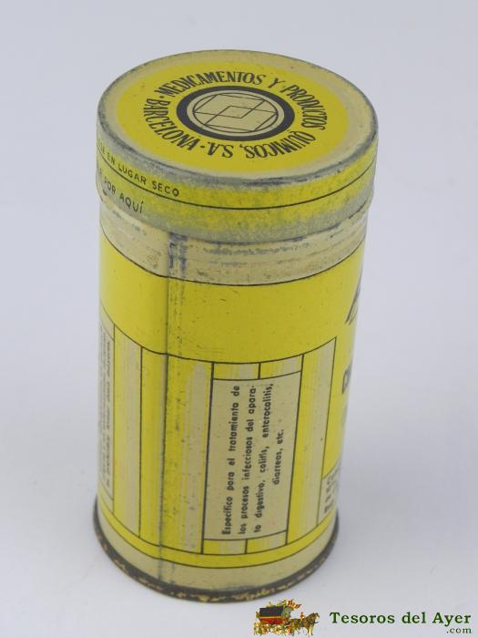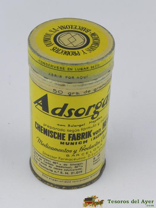ANTIGUA CAJA DE HOJALATA CON PUBLICIDAD DE FABRICA DE PRODUCTOS QUIMICOS VON HEYDEN, S.A. ADSORGAN - FARMACIA - GRANULADO 50 GRS. - MIDE 9.5 X 5 CMS.