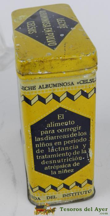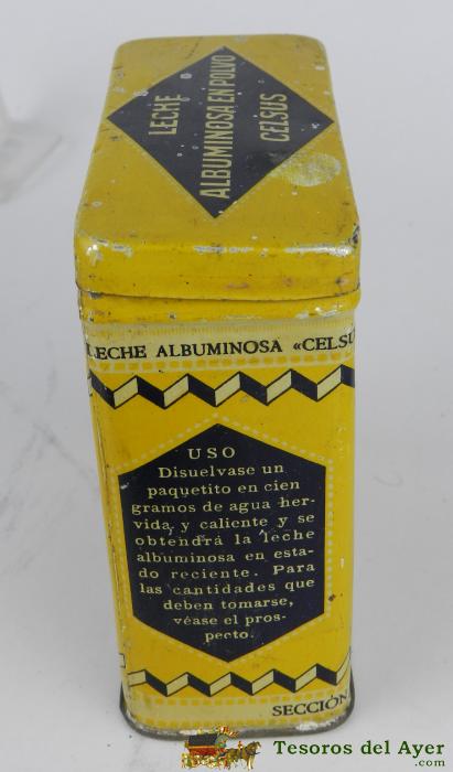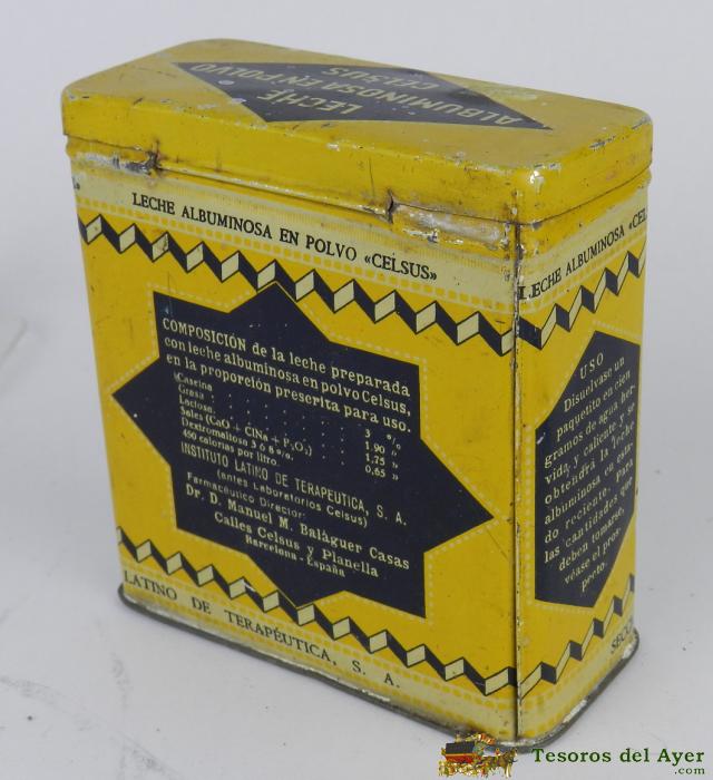 CAJA DE HOJALATA LITOGRAFIADA - LECHE ALBUMINOSA EN POLVO - CELSUS - G. DE ANDREIS,M.E. BADALONA, MIDE 11 X 10,5 X 5 CM.
