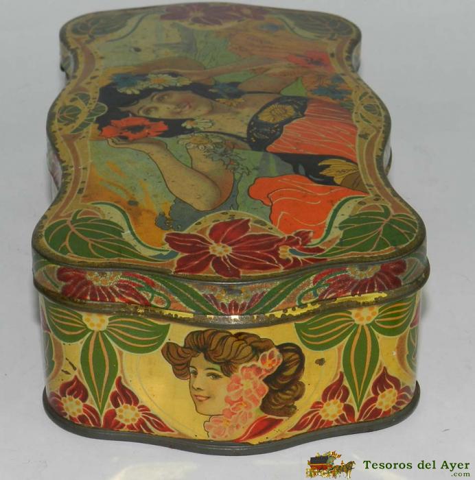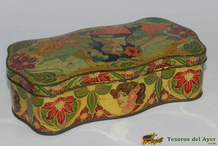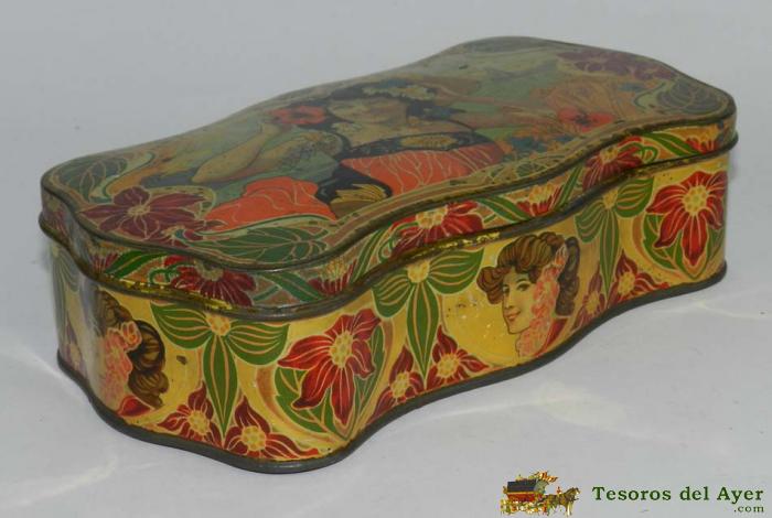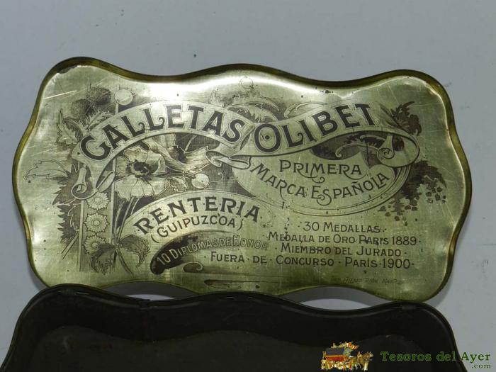 ANTIGUA CAJA DE GALLETAS OLIBET, RENTERIA, ILUSTRADOR MODERNISTA, IMPRESION ALFRED RIOMN NANTES, MIDE 20 X 10,5 X 7 CMS.