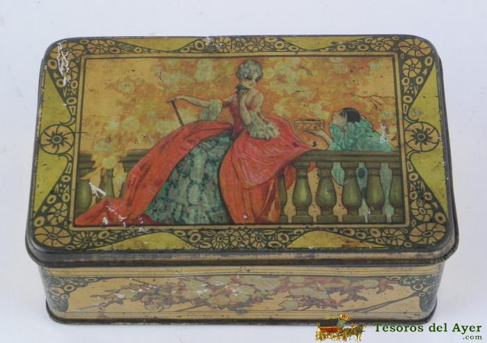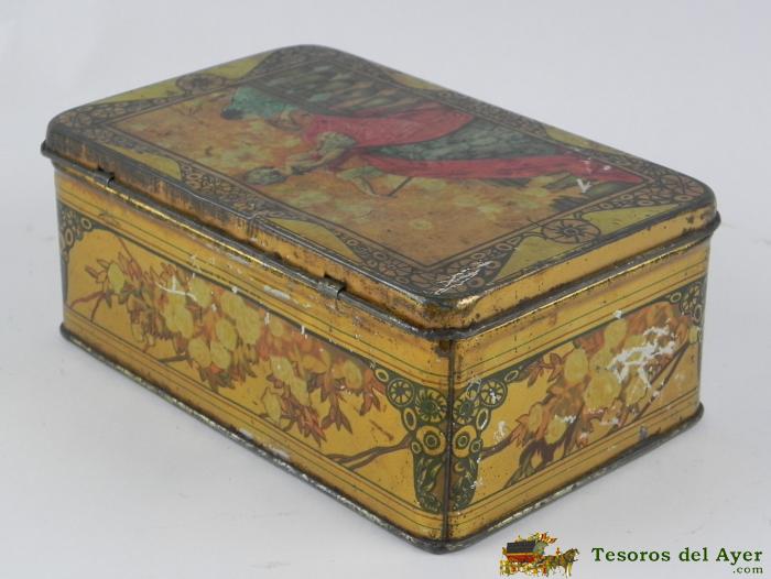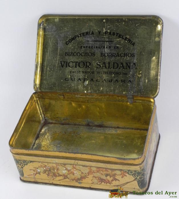 ANTIGUA CAJA DE HOJALATA LITOGRAFIADA CON PUBLICIDAD DE VICTOR SALDAÑA, GUADALAJARA, CONFITERIA Y PASTELERIA - MIDE 13 X 10 CMS.