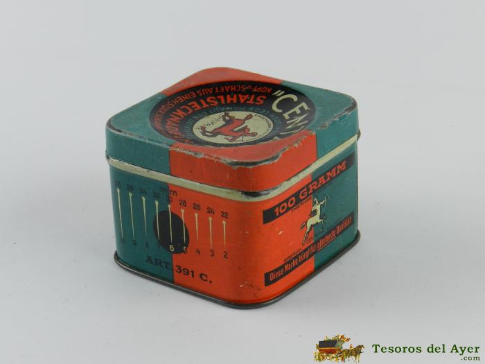 CAJA DE HOJALATA LITOGRAFIADA CON PUBLICIDAD DE CENTAUR STAHLSTECKNADELN, MIDE 6 X 6 X 4,5 CMS.