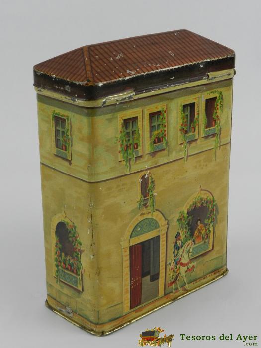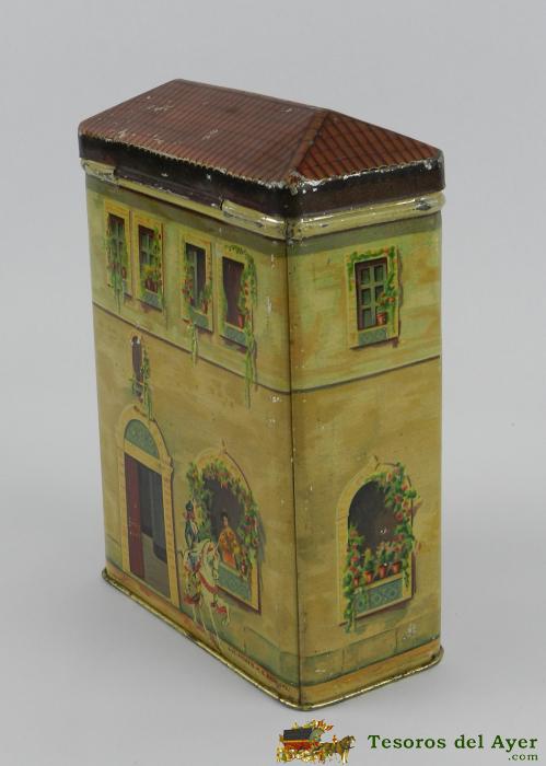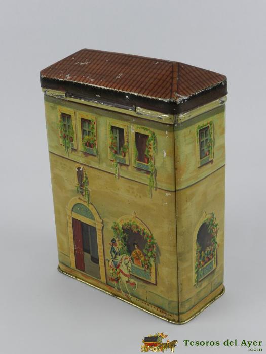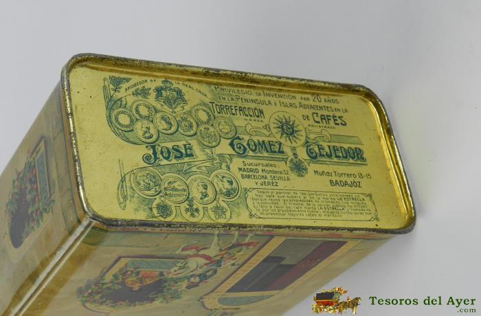 ANTIGUA CAJA HUCHA DE HOJALATA CON PUBLICIDAD DE JOSE GOMEZ TEJEDOR, CAFES LA ESTRELLA, BADAJOZ, BUEN ESTADO DE CONSERVACION, FABRICADA POR G. ANDREIS, MIDE 16,5 X 12,3 X 5,8 CMS.