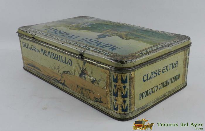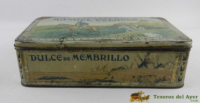 CAJA DE HOJALATA LITOGRAFIADA DE PUENTE GENIL, DULCE DE MEMBRILLO, MANUEL VELASCO, IMAGEN DE DON QUIJOTE. MIDE 29 X 17 X 8 CMS.