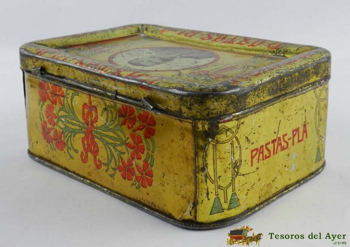 CAJA DE HOJALATA LITOGRAFIADA CON PUBLICIDAD DE PASTAS PLA, MAZARRON, MURCIA, MIDE 18,5 X 13 X 7 CMS.