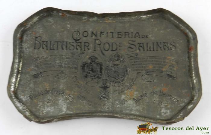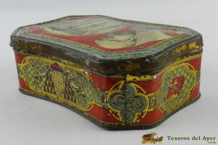 CAJA DE HOJALATA LITOGRAFIADA CON PUBLICIDAD DE CONFITERíA DE SALINAS. ALCALá DE HENARES. CENTENARIO DE LA UNIVERSIDAD COMPLUTENSE, IMAGEN DEL CARDENAL CISNEROS. MIDE 16 X 11 X 5 CMS.