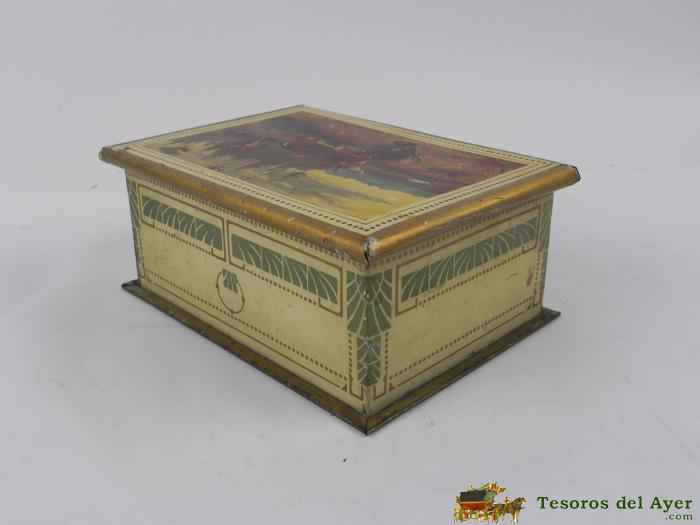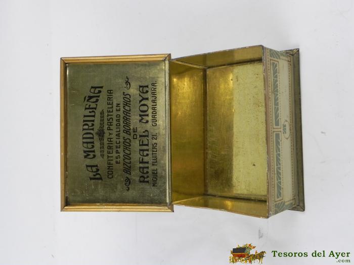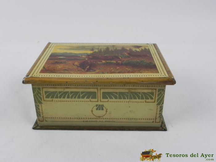 ANTIGUA CAJA DE HOJALATA LITOGRAFIADA CON PUBLICIDAD DE LA MADRILEÑA, CONFITERIA DE RAFAEL MOYA, GUADALAJARA, MIDE 15,5 X 11,5 CMS. CON ESCENAS DE CAZA.