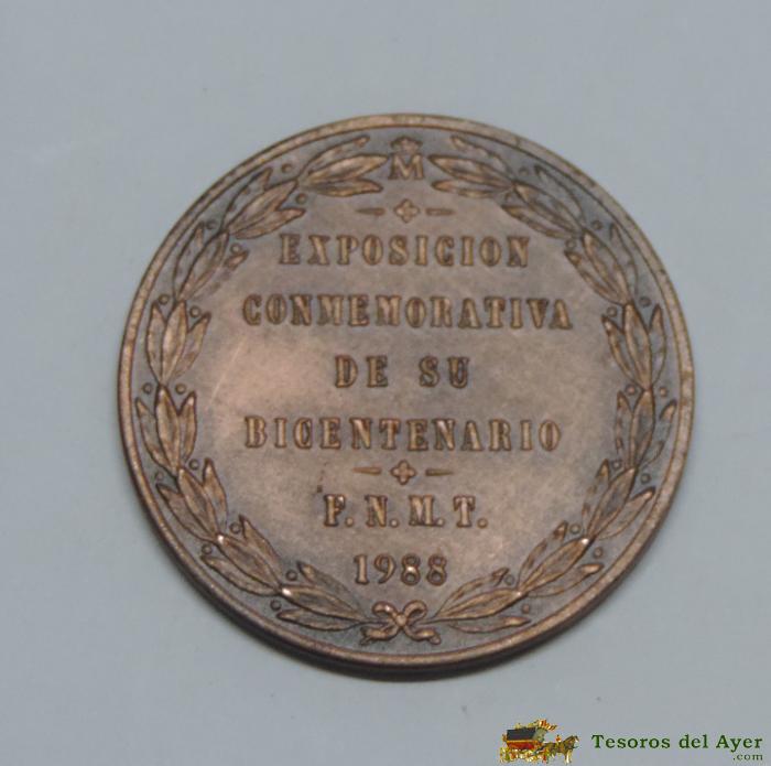 MEDALLA CONMEMORATIVA DE CARLOS III / EXPOSICIóN BICENTENARIO, AñO 1988, MEDIDAS APROXIMADAS: 4 CM DE DIAMETRO, PESO APROXIMADO 27 GRAMOS.