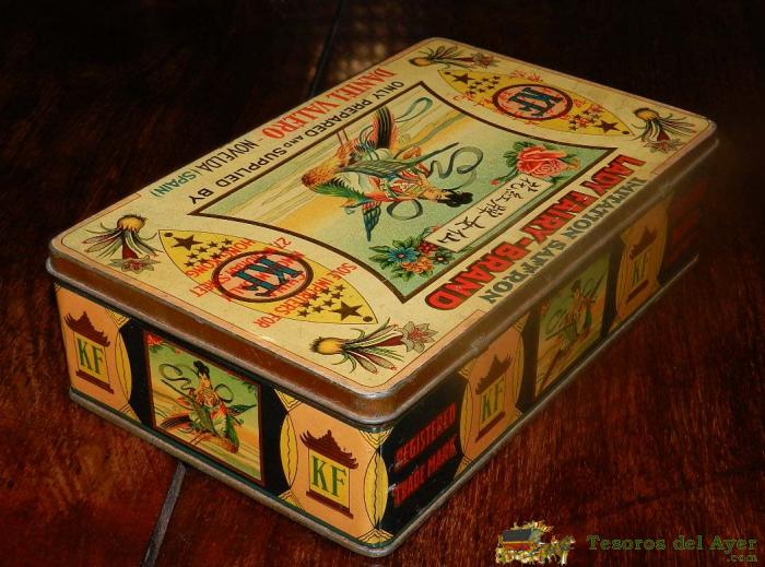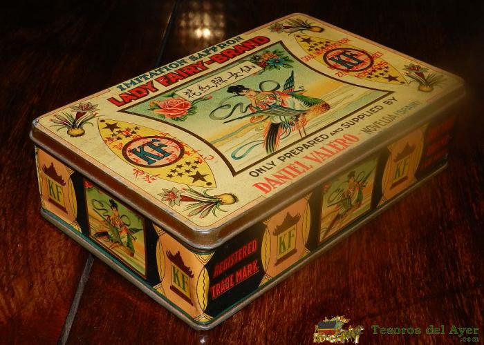 ANTIGUA CAJA DE HOJALATA LITOGRAFIADA CON PUBLICIDAD DE DANIEL VALERO, NOVELDA ESPAÑA, AZAFRAN, PARA LA EXPORTACION A ASIA, LADY FAIRY BRAND, IMITATION SAFFRON, MIDE 24 X 15 X 6,8 CMS. VER LAS FOTOGRAFIAS PUESTAS.