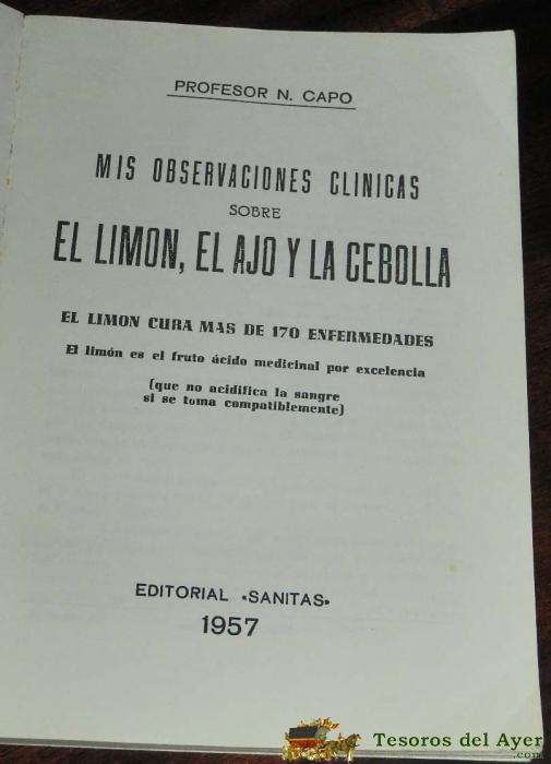 LIBRO MIS OBSERVACIONES CLINICAS SOBRE EL LIMON, EL AJO, LA CEBOLLA, POR N. CAPO, EL LIMON CURA MAS DE 170 ENFERMEDADES. EDICION CORREGIDA Y AUMENTADA. TIENE 103 PAGINAS. MIDE 19,5 X 13,5 CMS.