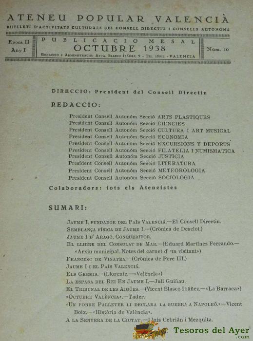 REVISTA ATENEU POPULAR VALENCIÀ, JAUME I, 1938, VII CENTENAR DE LA CONQUESTA, 9 OCTUBRE, BUTLLETI DE LES ACTIVITATS CULTURALS DEL CONSELL, MIDE 31 X 21 CMS. TIENE 16 PÁGINAS.