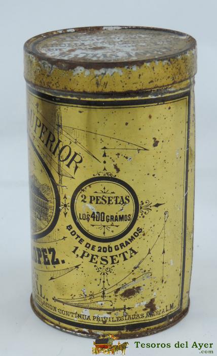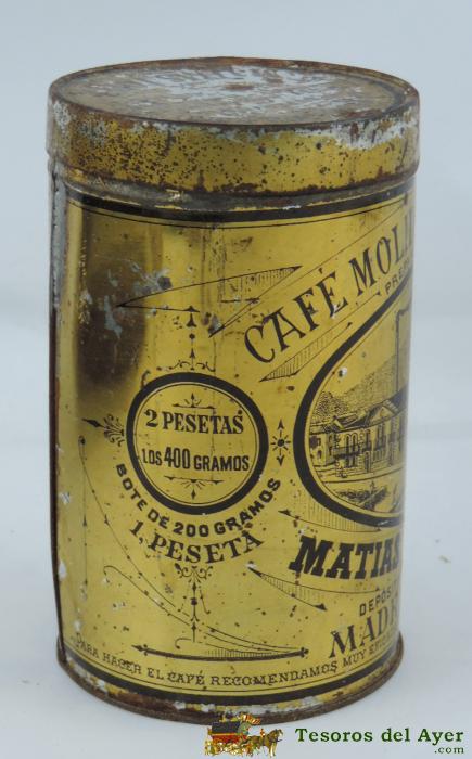 ANTIGUA CAJA DE HOJALATA LITOGRAFIADA - MATIAS LOPEZ - CAFE MOLIDO - MADRID ESCORIAL - 13 CM DE ALTA