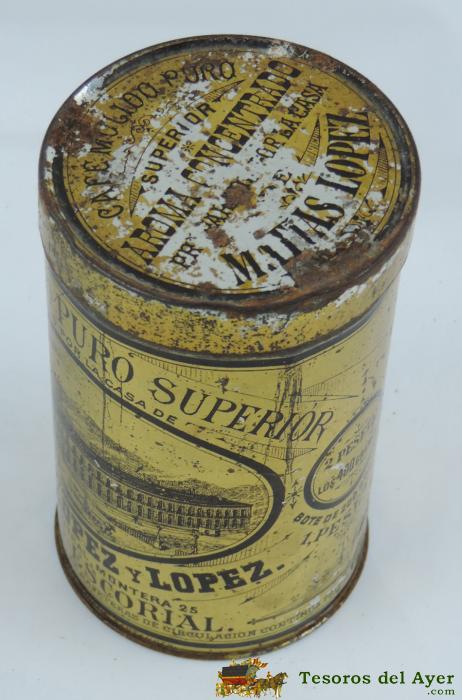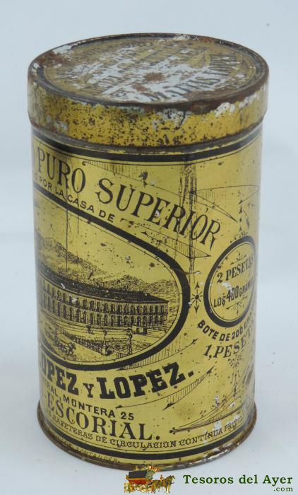 ANTIGUA CAJA DE HOJALATA LITOGRAFIADA - MATIAS LOPEZ - CAFE MOLIDO - MADRID ESCORIAL - 13 CM DE ALTA.