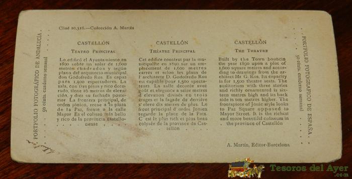 ANTIGUA FOTOGRAFIA ESTEREOSCOPICA DEL TEATRO PRINCIPAL DE CASTELLON, N.8, ED. A. MARTIN EDITOR - MIDE 17 X 8,2 CMS.