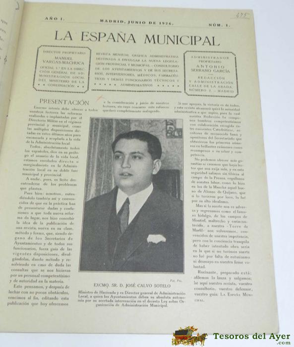 REVISTA LA ESPAÑA MUNICIPAL. JUNIO DE 1926. NUMERO 1. S.M. EL REY DON ALFONSO XIII, ALCALDE HONORARIO DE ESPAÑA. 16 PAG. MIDE 30,5 X 22,5 CMS.