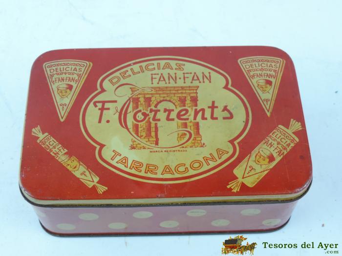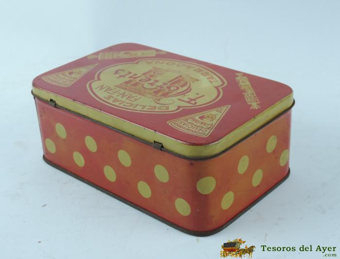 CAJA DE HOJALATA CON PUBLICIDAD DE DELICIAS FAN FAN, F. TORRENTS, TARRAGONA, MIDE 18 X 11 X 7 CMS.