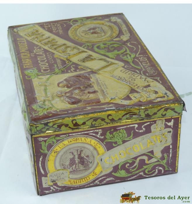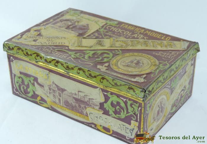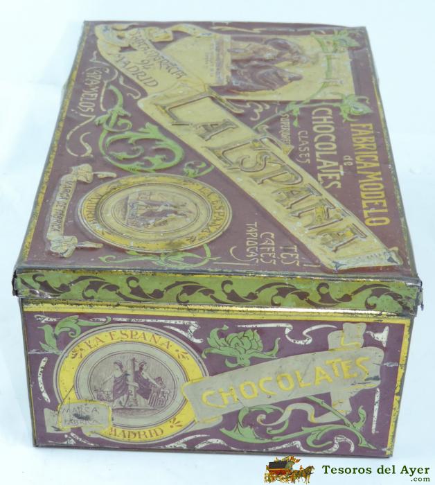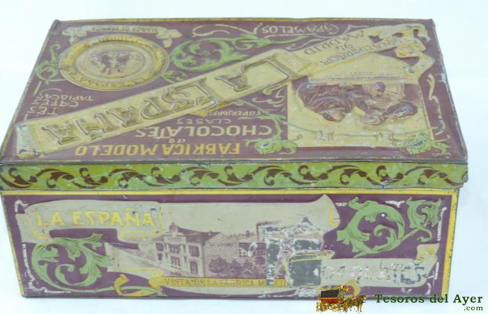 ANTIGUA CAJA DE HOJALATA LITOGRAFIADA CON PUBLICIDAD DE CHOCOLATES LA ESPAÑA, CAFES TES TAPIOCAS CARAMELOS SANTA ENGRACIA, MADRID, PP. S XX. MEDIDAS 26 X 17 X 10,5 CMS. TAL COMO SE VE EN LAS FOTOGRAFIAS PUESTAS.