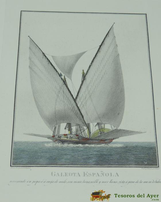 ANTIGUO GRABADO GALEOTA ESPAÑOLA, SIGLO XIX, DIBUJADO POR EL ALFÉREZ DE FRAGATA AGUSTÍN BERLINGUERO, GRABADO POR RODRÍGUEZ Y POR GASCÓ. PAPEL VERJURADO, MIDE 48 X 35,5 CMS. EXCELENTE ESTADO DE CONSERVACION, TAL COMO PUEDE VERSE EN LAS FOTOGRAFIAS PUESTAS.