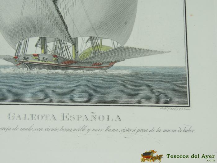 ANTIGUO GRABADO GALEOTA ESPAÑOLA, SIGLO XIX, DIBUJADO POR EL ALFÉREZ DE FRAGATA AGUSTÍN BERLINGUERO, GRABADO POR RODRÍGUEZ Y POR GASCÓ. PAPEL VERJURADO, MIDE 48 X 35,5 CMS. EXCELENTE ESTADO DE CONSERVACION, TAL COMO PUEDE VERSE EN LAS FOTOGRAFIAS PUESTAS. EXCEPCIONAL