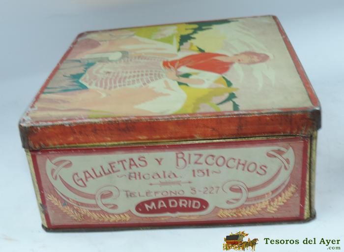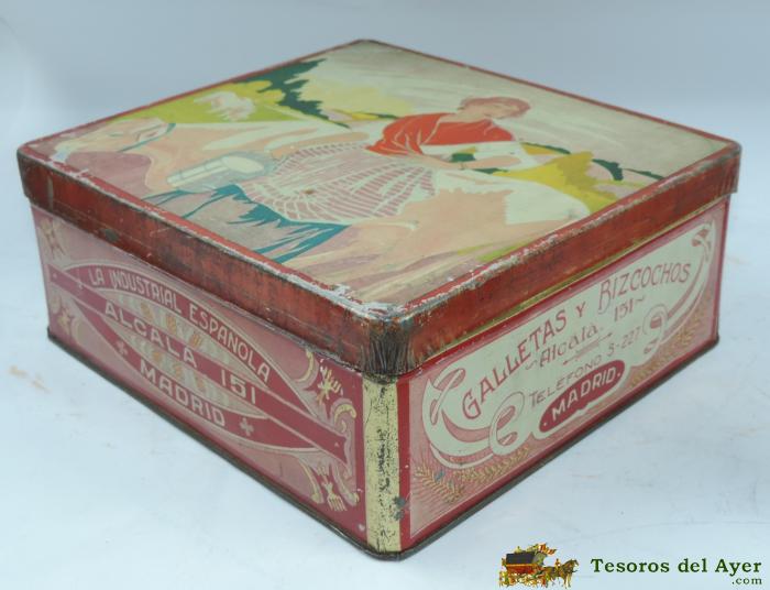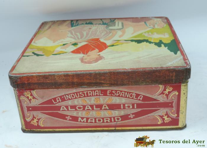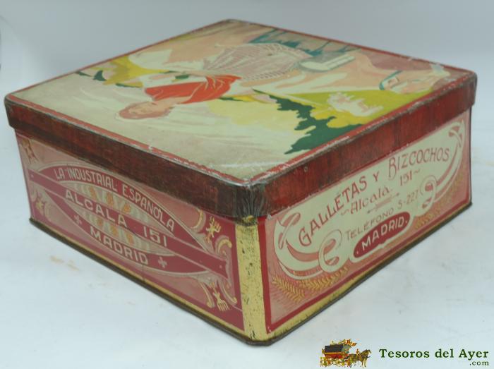 ANTIGUA CAJA DE HOJALATA CON PUBLICIDAD DE GALLETAS Y BIZCOCHOS, LA INDUSTRIAL ESPAñOLA, MADRID ALCALA 151, MIDE 23 X 21 X 9 CMS.