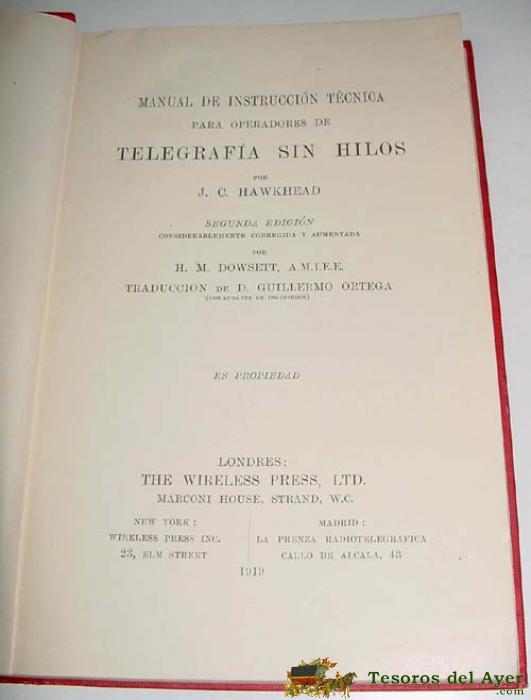HAWKHEAD, J.C. - DOWSETT, H.M. - 1919. WIRELESS PRESS, LONDRES. 2A ED. TRAD. DE GUILLERMO ORTEGA. IL. EN B/N. XVI+333 P. 22X14 CM. ENC. TELA. PERFECTO ESTADO DE CONSERVACION.FOTOS E ILUSTRACIONES.