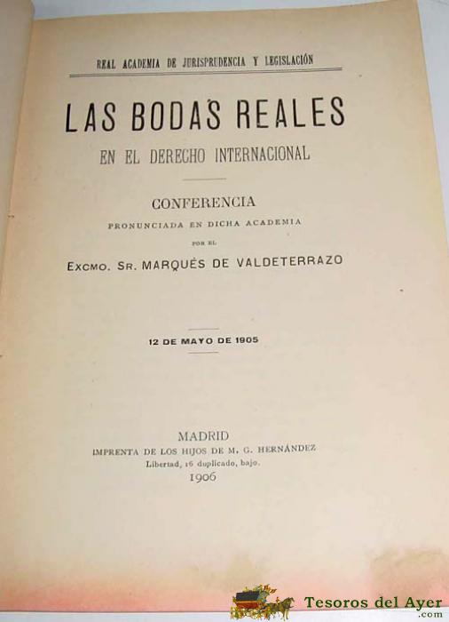 LAS BODAS REALES EN EL DERECHO INTERNACIONAL - VALDETERRAZO, MARQUES DE - 1906, 19 CM., 178 PAG., HOLANDESA MEDIA PIEL MODERNA, CONSERVA CUBIERTAS ORIGINALES. CONFERENCIA PRONUNCIADA EN LA REAL ACADEMIA DE JURISPRUDENCIA Y LEGISLACIóN. IMP. DE LOS HIJOS