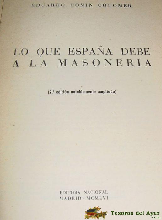 LO QUE ESPAÑA DEBE A LA MASONERÍA - COMIN,EDUARDO - EDITORA NACIONAL. MADRID 1956 EDICION NOTABLEMENTE AMPLIADA. RúSTICA CON CAMISA. 246 PáGINAS APéNDICE DOCUMENTAL. 14X21,5 CMS. HISTORIA, MASONERíA