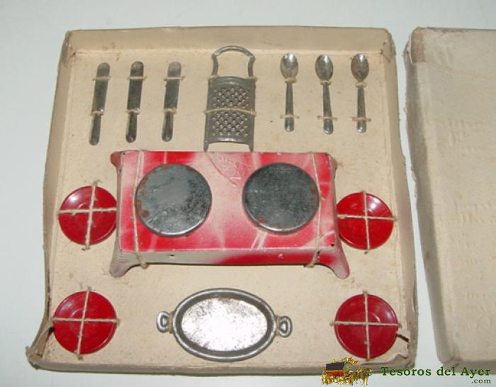 ANTIGUO JUEGO DE COCINA Y CACHARRITOS DE CHAPA AÑOS 40 - POSIBLMENTE FABRICADO POR PAYA O POR RICO (IBI) . CON SU CAJA ORIGINAL DE CARTON QUE MIDE 20 X 20 CMS. - APROXIMADAMENTE.