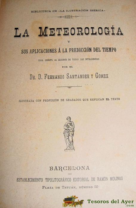 LA METEOROLOGÍA Y SUS APLICACIONES A LA PREDICCIÓN DEL TIEMPO - SANTANDER Y GÓMEZ, FERNANDO - 1898 23 CM., 404 PAG., TELA ORIGINAL ESTAMPADA. 109 ILUSTRACIONES INTERCALADAS. SEGúN PALAU 299688, LA OBRA TIENE 412 PáGINAS. ESTAB. TIP. ED. DE RAMóN MOLINAS. METEOROLOGIA MARINA