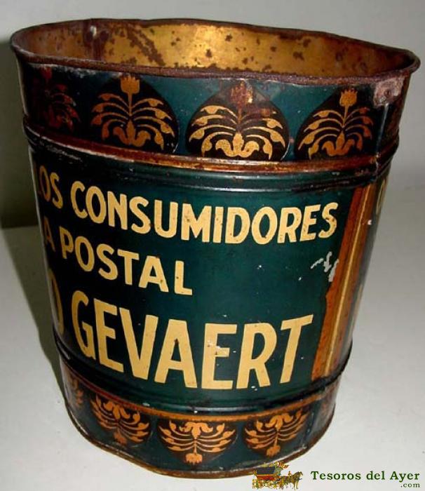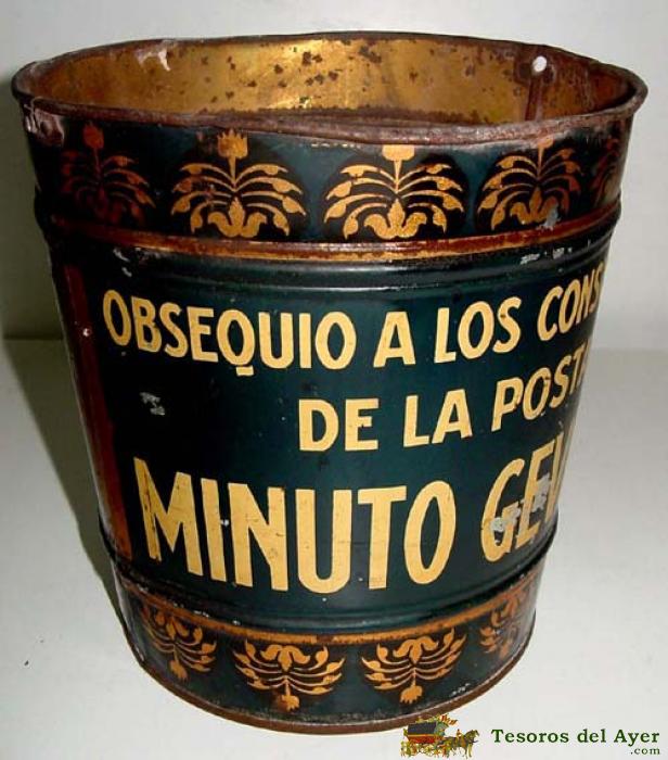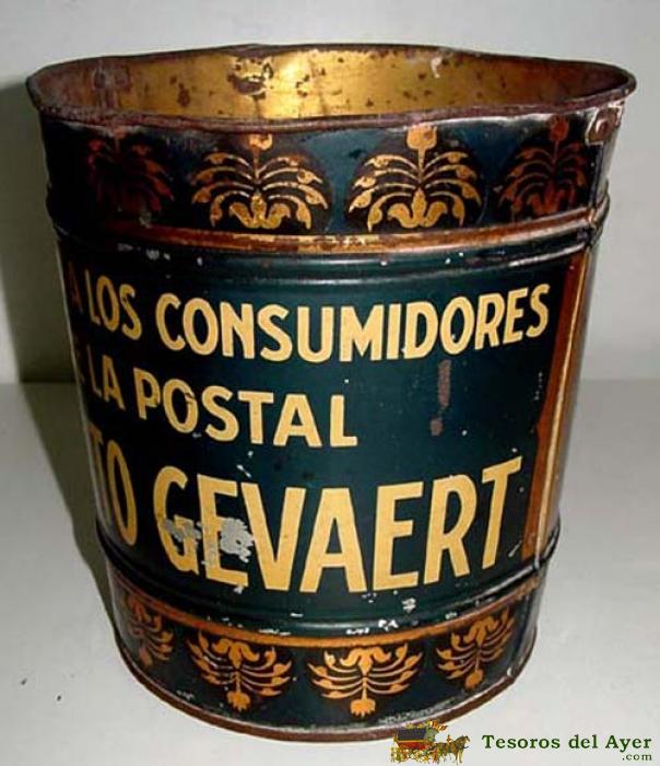 ANTIGUO CUBO DE HOJALATA LITOGRAFIADA CON PUBLICIDAD DE OBSEQUIO A LOS CONSUMIDORES DE LA POSTAL MINUTO GEVAERT - MIDE 20 CMS. DE ALTURA Y 19 CMS. DE DIAMETRO . TIN