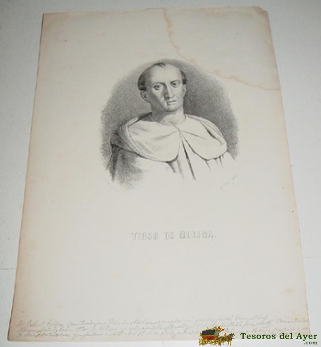 ANTIGUA LITOGRAFIA - TIRSO DE MOLINA - APROX. 1850 DE J. CEBRIAN, DIBº Y LITº, LIT. J. DONON MADRID - MIDE 33,5 X 23,5 CMS. TAL COMO SE VE EN LAS 2 FOTOS QUE HEMOS SACADO.