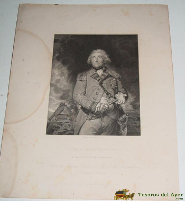 ANTIGUO GRABADO LORD HEATHFIELD - WITH THE KEYS OF GIBRALTER - GIBRALTAR - FROM THE ORIGINAL PICTURE BY SIR POSHUA REYNOLDS IN THE NATIONAL GALLERY - Nº 19 - GRADADO POR R. PAGE - MIDE 27 X 20 CMS.