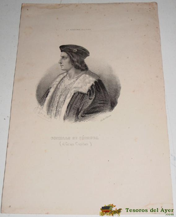 ANTIGUO LITOGRAFIA DE GONZALO DE CORDOBA - LA ACADEMIA MILITAR - EL GRAN CAPITAN - LIT. DE J. DONON - MIDE 30,5 X 20 CMS.