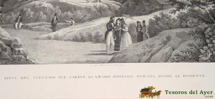 ANTIGUA LITOGRAFIA F. BRAMBILLA LO PINTó, ASSELINEAU LO LITOGRAFIó, J. DE MADRAZO LO DIRIGIO, VISTA DEL INTERIOR DEL JARDIN LLAMADO ROBLEDO TOMADA DESDE EL PONIENTE, REAL ESTUDIO - MIDE 73 X 50 CMS - TAL COMO SE VE EN LAS FOTOGRAFIAS.