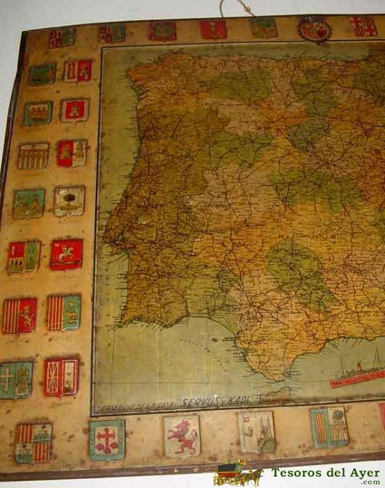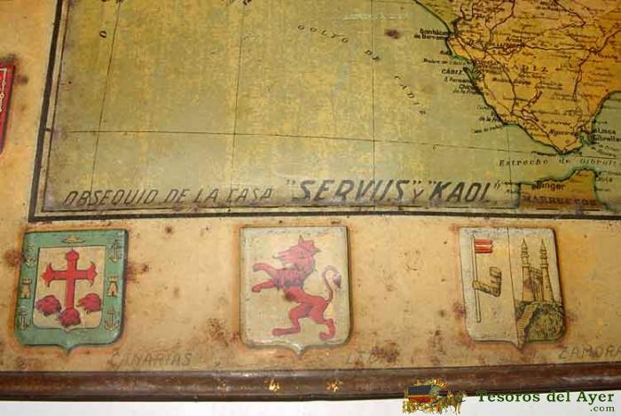 ANTIGUA CHAPA DE HOJALATA LITOGRAFIADA CON PUBLICIDAD DE SERVUS Y KAOL - MAPA DE ESPAÑA - MIDE 67X49 CMS.