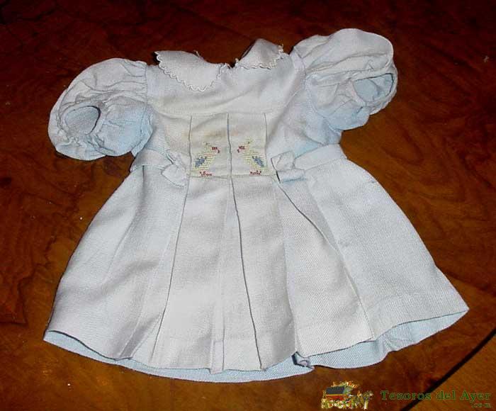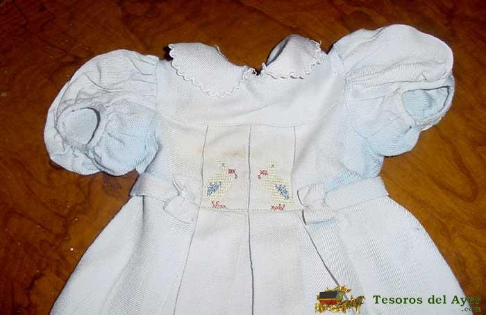 VESTIDO DE VIYELA DE LA MUÑECA GISELA, TIENE BORDADO EN PUNTO DE CRUZ, UNOS POLLITOS , ESTÁ EN BUEN ESTADO. HA PERDIDO UN POCO LA TONALIDAD AZUL, POR EL PASO DEL TIEMPO.
