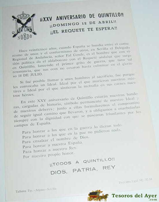 ANTIGUO PROGRAMA. EL REQUETÉ VELA LAS ARMAS. EN EL XXV ANIVERSARIO DEL QUINTILLO (ABRIL 1934 - ABRIL 1959). HOJA MIDE 16 X 11 CMS. CARLISMO. ANDALUCíA. CARLISMO, ANDALUCIA