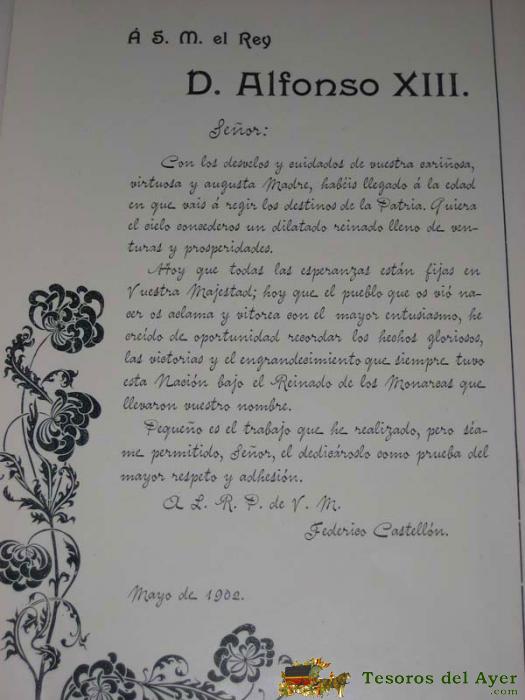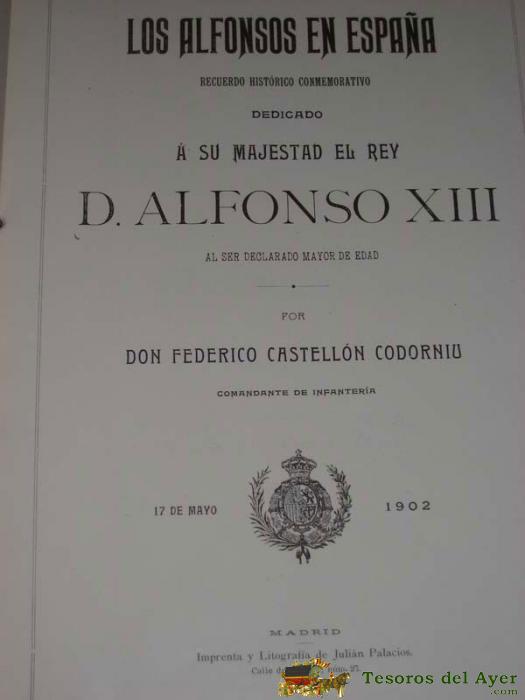 LOS ALFONSOS EN ESPAÑA - FEDERICO CASTELLON CODORNIU - JULIAN PALACIOS, MADRID, 1902. RUSTICA. 28,5 X 21. RECUERDO HISTORICO CONMEMORATIVO DEDICADO AL REY DON ALFONSO XIII AL SER DECLARADO MAYOR DE EDAD. REYES QUE SE LLAMARON ALFONSO. CONTIENE LAMINAS FUERA DEL TEXTO - 41 PAGINAS - MUY BONITO