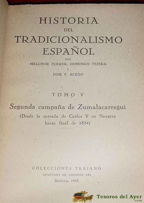 HISTORIA DEL TRADICIONALISMO ESPAÑOL - CARLISMO - TOMO V - MELCHOR FERRER, DOMINGO TEJERA, JOSE F. ACEDO - EDITORIAL CATOLICA ESPAÑOLA - SEGUNDA CAMPAÑA DE ZUMALACARREGUI SU PRIMERA CAMPAÑA, DESDE LA ENTRADA DE CARLOS V EN NAVARRA HASTA EL FINAL DE 1834 - 22,5 X 16 CMS. TIENE 285 PAGINAS - 1943 - 1ª EDICION