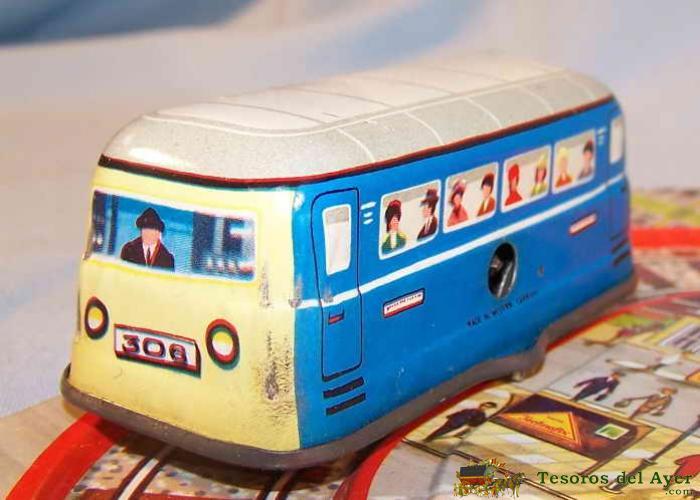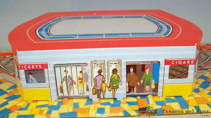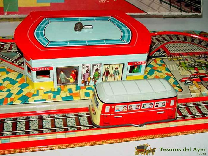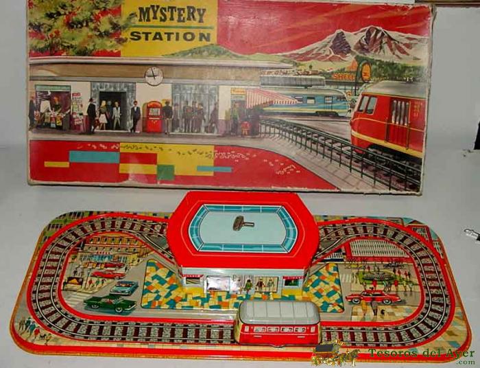 ANTIGUA PISTA DE HOJALATA LITOGRAFIADA A CUERDA, TECHNOFIX 306 MUYSTERY STATION, AñOS 60 CON SU CAJA ORIGINAL Y SU LLAVE ORIGINAL - LA CAJA MIDE 51 CMS. DE LONGITUD - PERFECTO. ES ASOMBROSO Y ESTUPENDO.