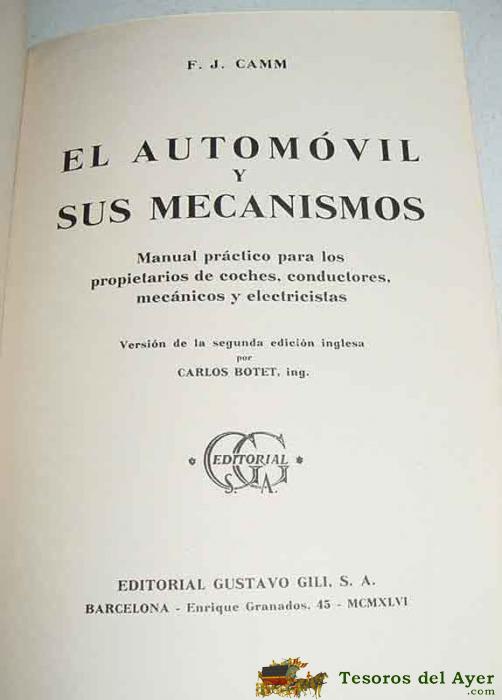 EL AUTOMóVIL Y SUS MECANISMOS. MANUAL PRáCTICO PARA LOS PROPIETARIOS DE COCHES, CONDUCTORES, MECáNICOS Y ELECTRICISTAS. VERSIóN DE LA SEGUNDA EDICIóN INGLESA POR CARLOS BOTET. CAMM, F. J. EDITORIAL GUSTAVO GILI,, BARCELONA, 1946. 8º MAYOR. 270 PáGINAS; DIBUJOS EN NEGRO DENTRO DEL TEXTO. CARTONé EDITORIAL