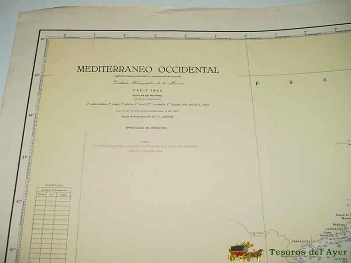 ANTIGUO MAPA DEL MEDITERRANEO OCCIDENTAL - ESPAÑA, FRANCIA, ITALIA, SICILIA, MARRUECOS, TUNEZ, ARGELIA, INSTITUTO HIDROGRAFICO DE LA MARINA - CADIZ 1952 - CORREGIDA POR AVISOS A LOS NAVEGANTES HASTA 31 DE OCTUBRE DE 1959 - SONDAS Y ELEVACIONES EN METROS -