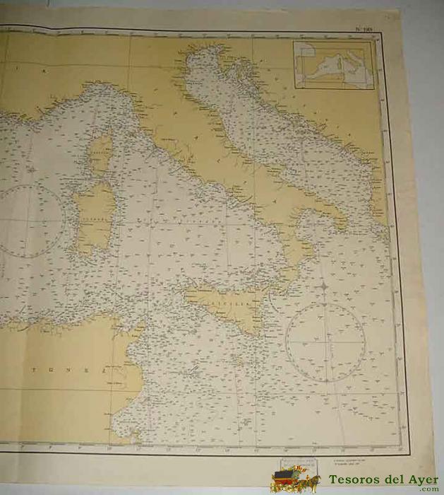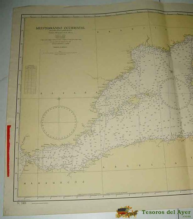 ANTIGUO MAPA DEL MEDITERRANEO OCCIDENTAL - ESPAÑA, FRANCIA, ITALIA, SICILIA, MARRUECOS, TUNEZ, ARGELIA, INSTITUTO HIDROGRAFICO DE LA MARINA - CADIZ 1952 - CORREGIDA POR AVISOS A LOS NAVEGANTES HASTA 31 DE OCTUBRE DE 1959 - SONDAS Y ELEVACIONES EN METROS - MIDE 110 X 72 CMS.