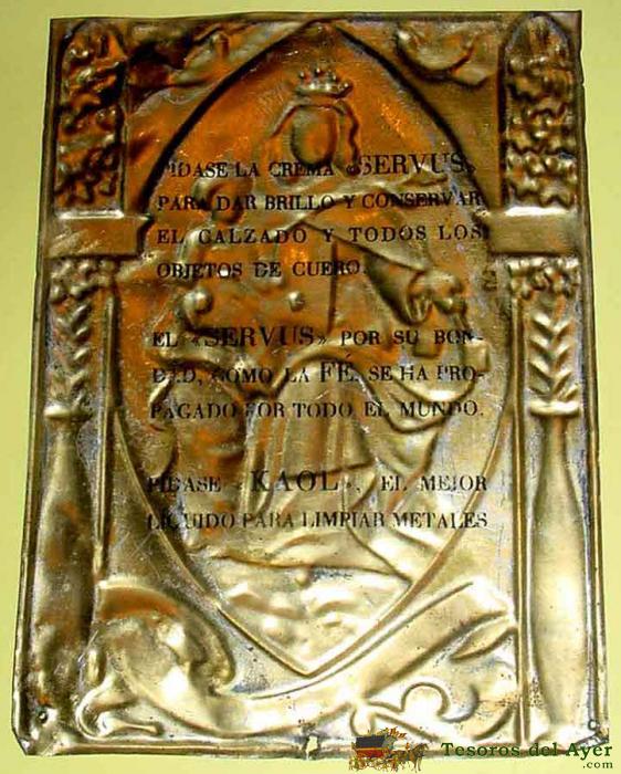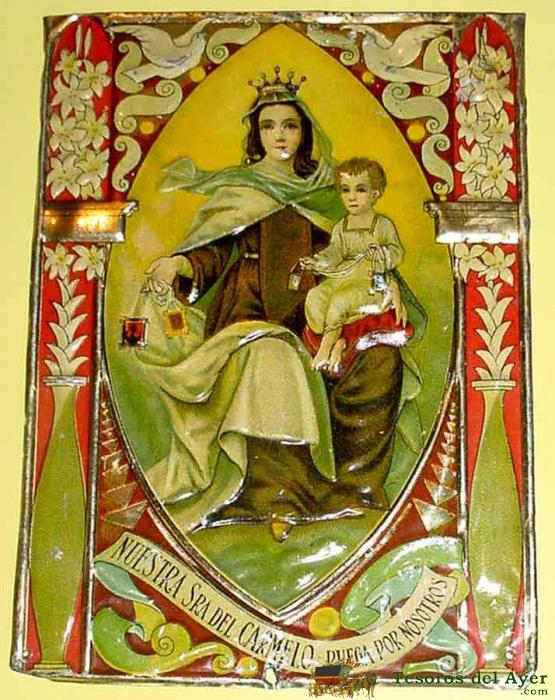 ANTIGUA CHAPA DE HOJALATA LITOGRAFIADA DE NUESTRA SEÑORA DEL CARMELO CON PUBLICIDAD DE SERVUS Y KAOL PARA LIMPIAR METALES - SE PONIA EN LA PUERTA DE LAS CASAS - MIDE 13,8 X 10,2 CMS. BUEN ESTADO DE CONSERVACION