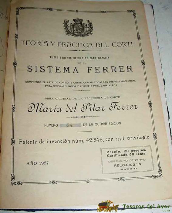 TEORIA Y PRACTICA DEL CORTE . NUEVO METODO SISTEMA FERRER, COMPLETO, EXACTO Y SENCILLO POR MARIA DEL PILAR FERRER . ARTE DE CORTAR Y CONFECCIONAR TODAS LAS PRENDAS NECESARIAS PARA SEÑORAS Y NIÑOS Y LENCERIA PARA CABALLEROS - 1927 - 127 PAGINAS - MIDE 30,5 X 22 CMS. MUCHOS PATRONES