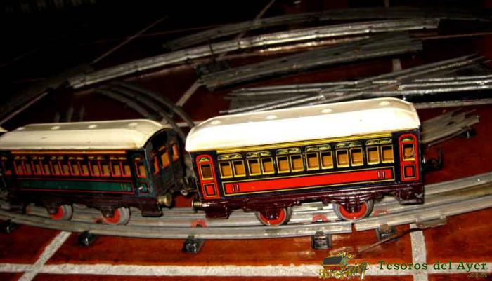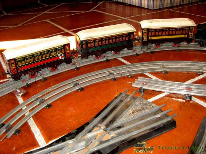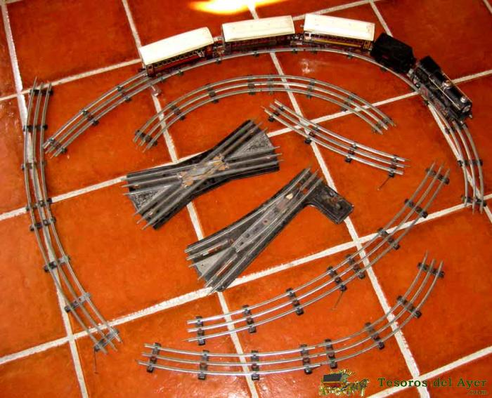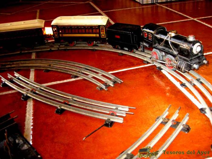 ANTIGUO TREN ELECTRICO PAYA DE ESCALA 0 ES DECIR 1:45 - TODO DE CHAPA LITOGRAFIADO, CON UN MONTON DE VIAS Y DESVIOS, SE COMPONE DE LOCOMOTORA, CARBONERA, Y TRES VAGONES DE PASAJEROS, TAL COMO SE VE EN LA FOTO. LA MAQUINA NO LA HEMOS PROBADO, EN CASO DE Q