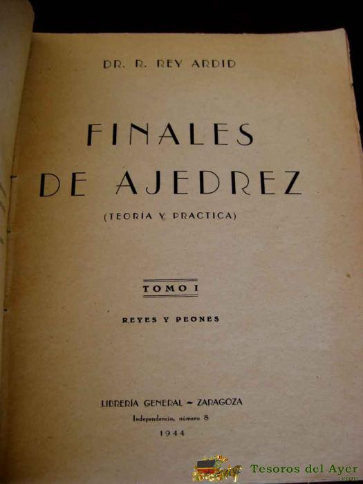 FINALES DE AJEDREZ (TEORIA Y PRÁCTICA). I: REYES Y PEONES. REY ARDID, RAMóN. LIBRERíA GENERAL., ZARAGOZA, 1944. TEXTO A DOS COLUMNAS, FIGURAS INTERCALADAS. TAMAñO: 24 CM. 250 PAG. + 4 H.